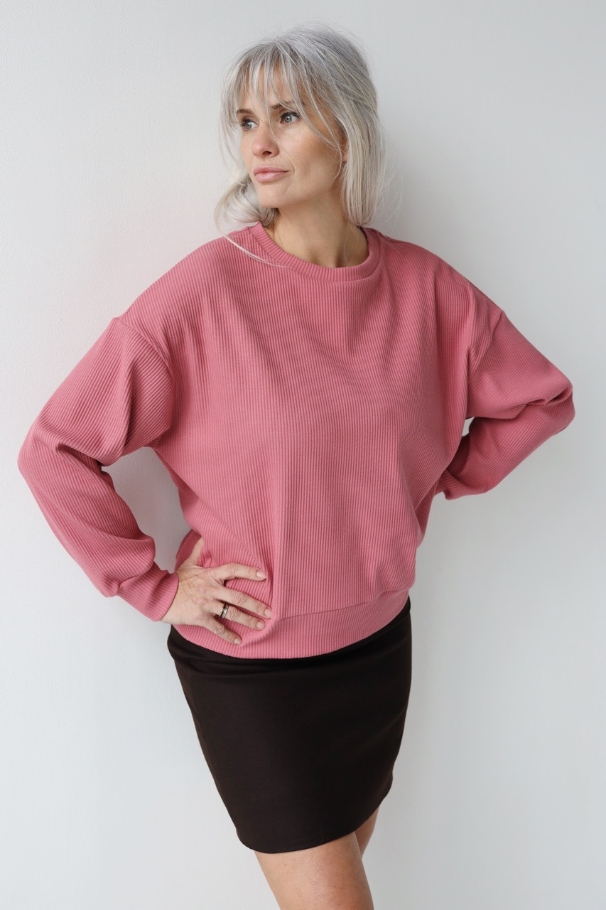 Bluza damska o luźnej formie która nadaje jej nieco romantycznego i nonszalanckiego charakteru. Okrągły dekolt w połączeniu z krojem oversize wspaniale sprawdzi się u miłośniczek komfortu. Będzie idealną bazą Twoich całorocznych stylizacji. Zestaw ją z ulubioną spódnicą, spodniami czy legginsami z naszej kolekcji. Dzianina prążkowana sprawia, że bluza jest bardziej elegancka od tradycyjnej bluzy dresowej. Wykorzystasz ją również w biurowych stylizacjach.
