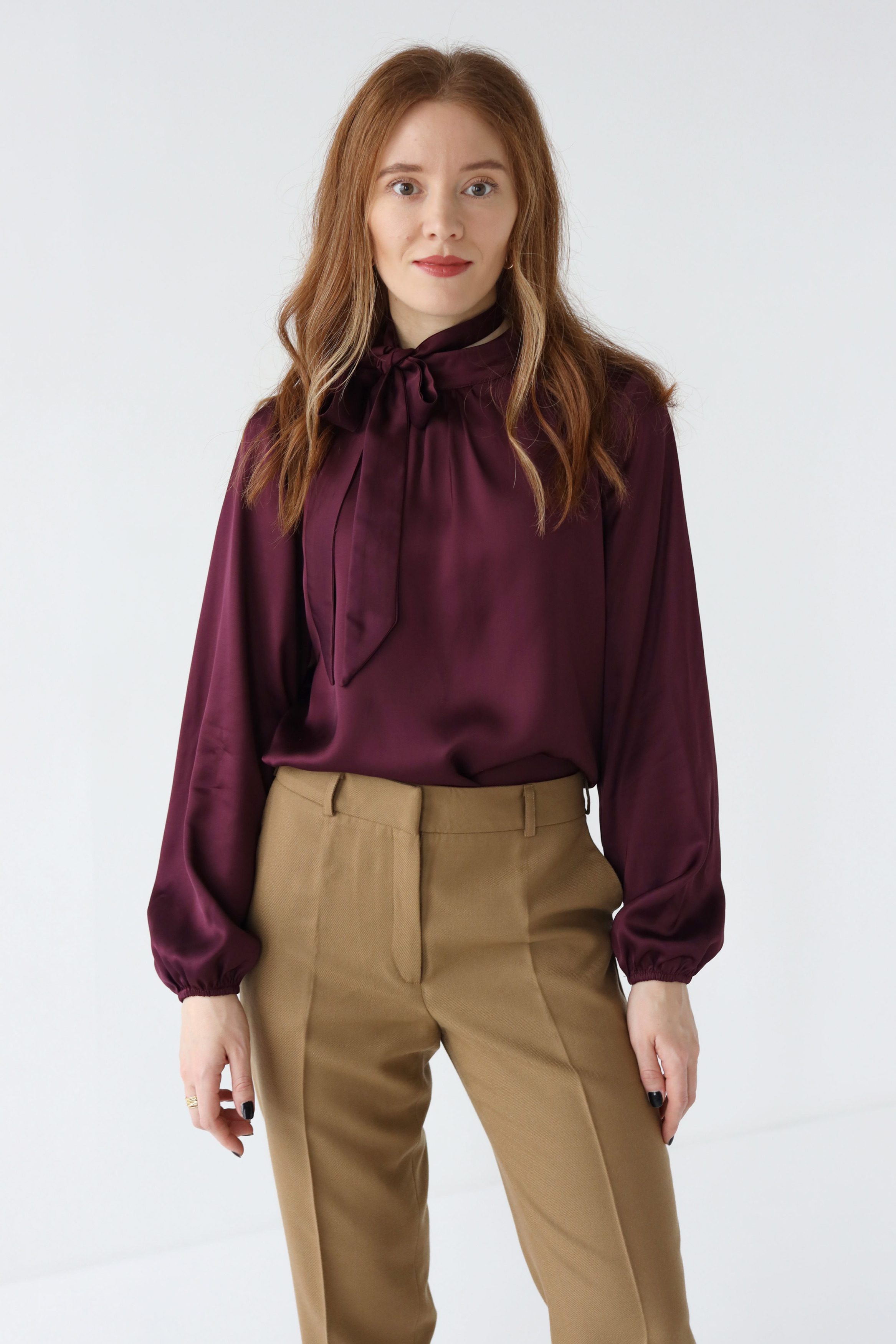 Bluzka z wiskozy satynowej SLOANE. Elegancki model z dodatkowym paskiem, który można przewiązać wokół szyi lub w talii. Delikatne marszczenie przy dekolcie subtelnie podkreśla linię szyi, a rękawy wykończone elastyczną gumką zapewniają wygodę noszenia. Dostępna w dwóch kolorach: beżowym i bordowym. Zapinana z tyłu, na wygodny guzik.