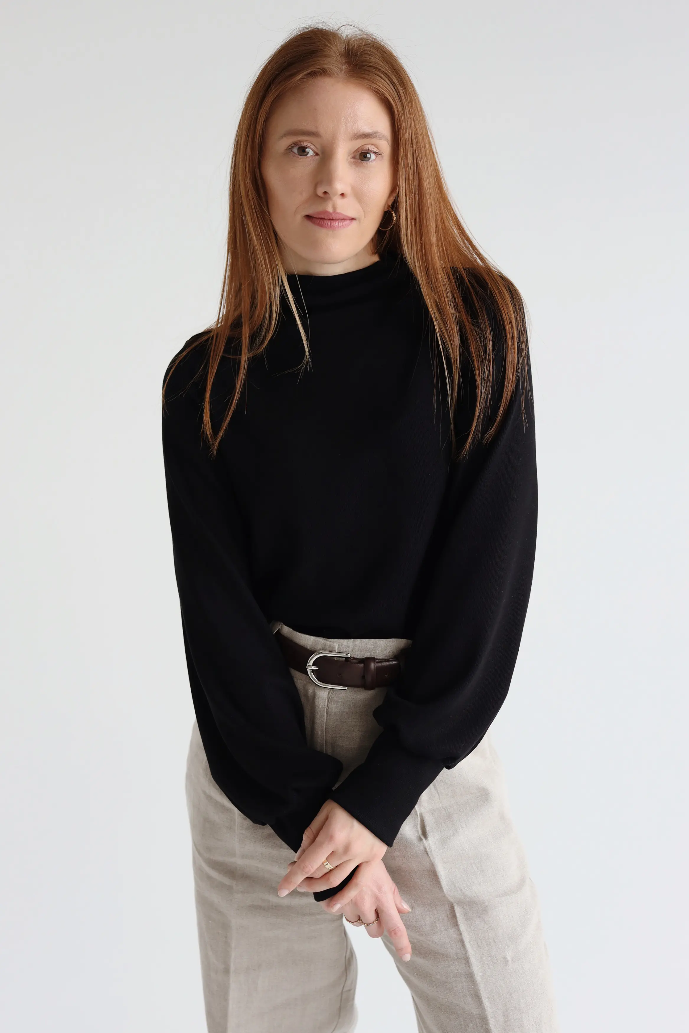 Bluzka ze stójka i bufiastym rękawem OCTAVIA to ponadczasowy model wykonany z mięsistej, ultra-miękkiej wiskozy, która pięknie układa się na sylwetce i zapewnia wysoki komfort noszenia. Fason pod szyję z delikatną stójką nadaje jej eleganckiego charakteru, a luźniejsza forma gwarantuje swobodę ruchów. Ozdobne wykończenie rękawów przy nadgarstkach stanowi subtelny detal, który wyróżnia ten model.