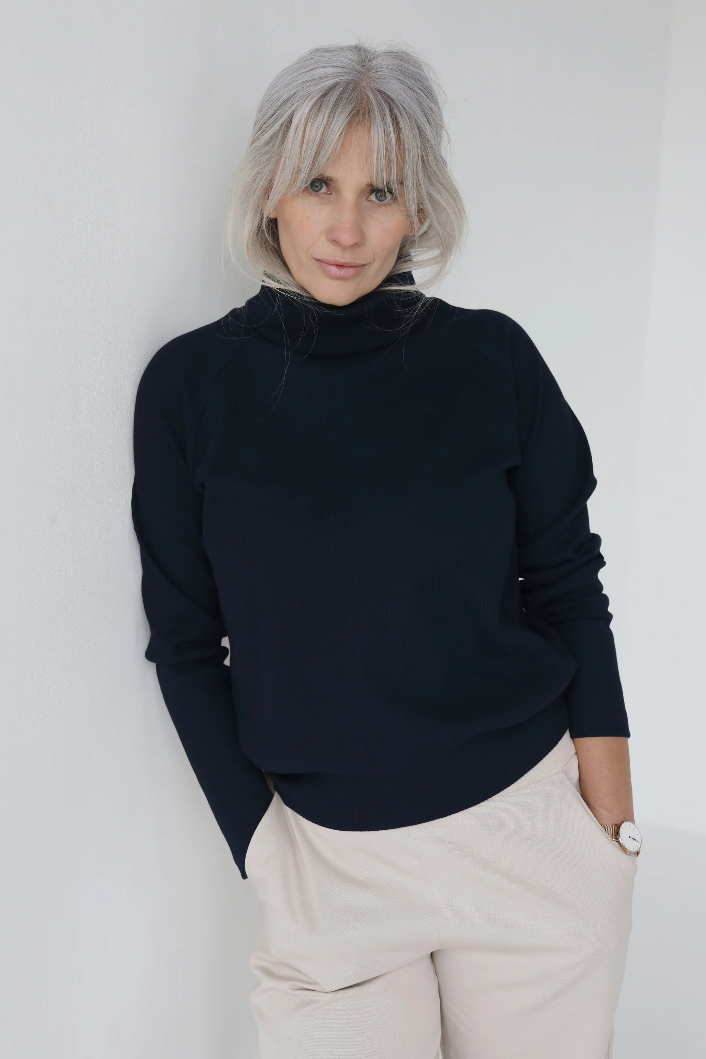 Golf damski o luźnej formie. Raglanowe rękawy nadają mu wyjątkowego charakteru i sprawiają, że golf jest bardzo komfortowy. Świetnie łączy się z jeansami oraz ze spódnicami i spodniami z naszej kolekcji. Golf odszyliśmy z bawełnianej dzianiny prążkowanej, która nadaje mu elegancji. Golf ALMA u dołu ma lekki ściągacz, dzięki czemu świetnie się układa na biodrach. Połącz go z trenczem FRANCES z naszej kolekcji.