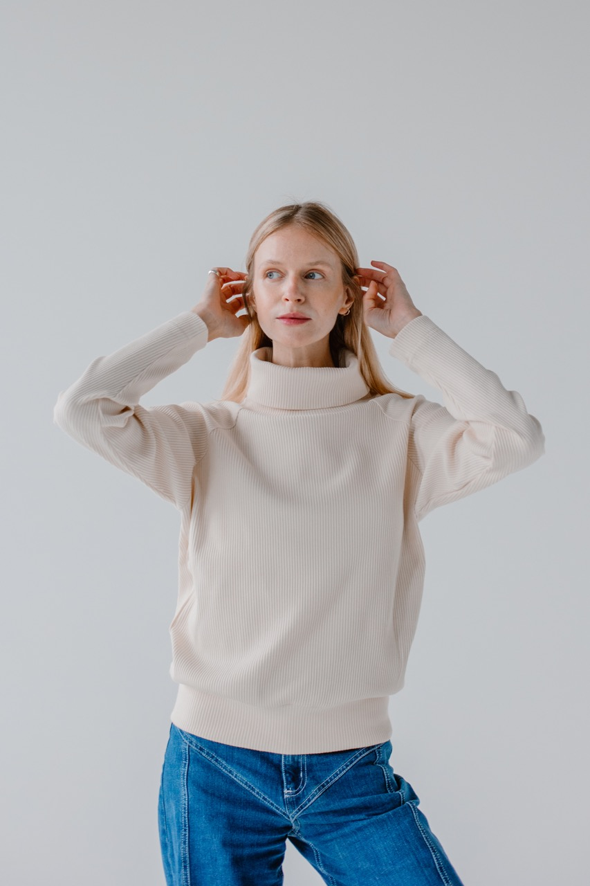 Golf o luźnej formie, nonszalanckiej formie. Raglanowe rękawy dodają mu wyjątkowego charakteru, a ściągacz u dołu sprawia, że golf ładnie układa się na biodrach. Świetnie łączy się z jeansami oraz ze spódnicami i spodniami z naszej kolekcji.