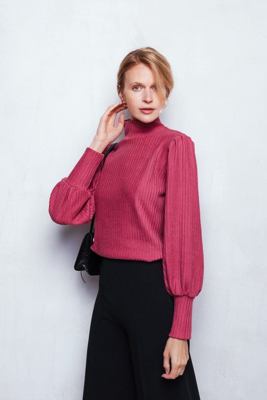 Golf z bufiastymi rękawami z bawełnianej dzianiny – EIRIS. Golf ma przepiękne bufiaste rękawy zakończone wysokim ściągaczem. Bardzo kobiecy i zmysłowy krój, który nada Twoim stylizacjom wyjątkowego charakteru.