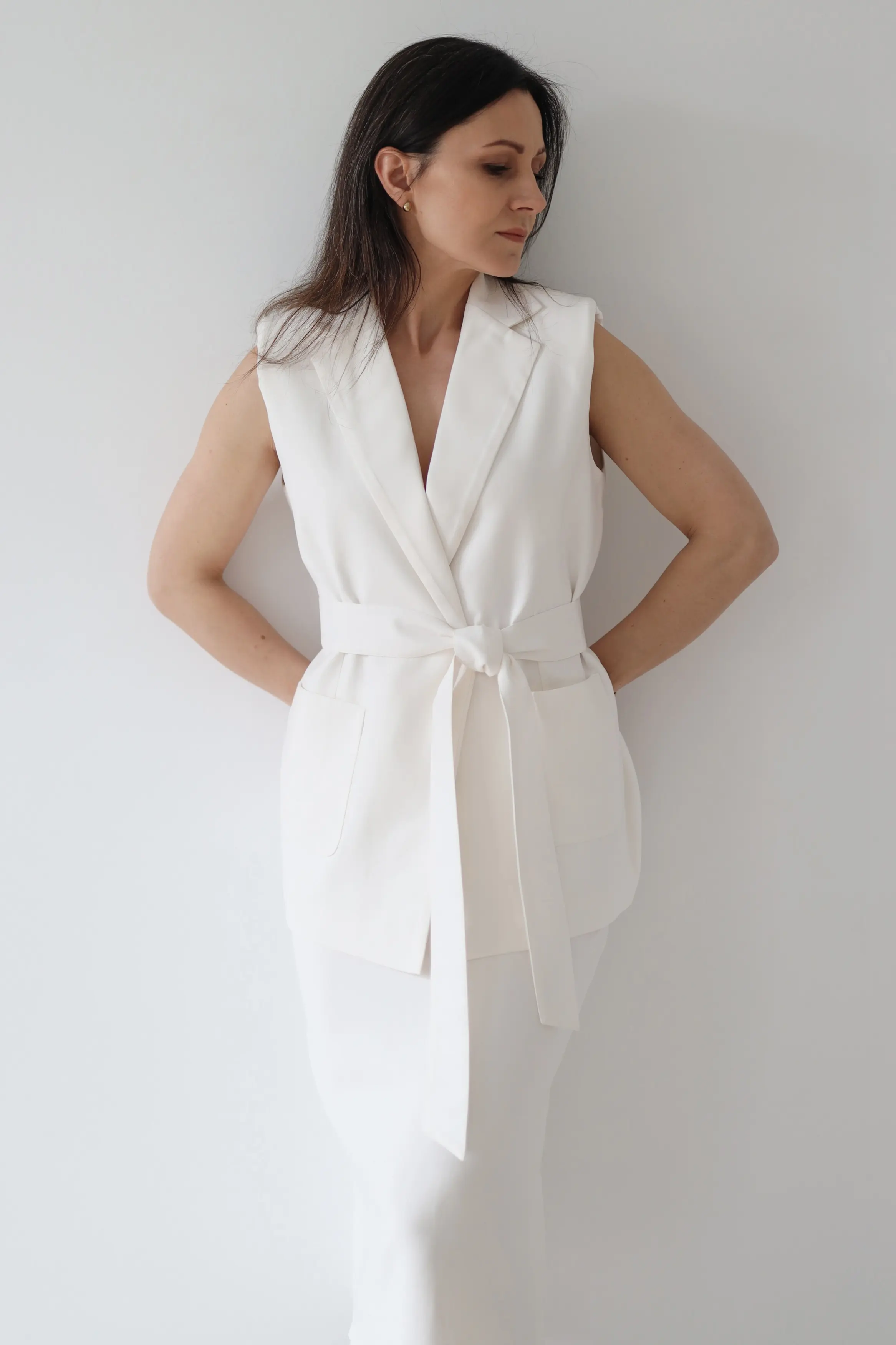 Kamizelka marynarkowa z paskiem to ciekawa propozycja do wiosennych stylizacji. Możesz ją zestawić z elegancką spódnicą czy cygaretkami, ale równie stylowo będzie się prezentować z jeansami. Kamizelka ma podszewkę wiskozową. Przewiąż ją paskiem z tej samej tkaniny lub noś rozpiętą. To bardzo elegancki model w kobiecej szafie.