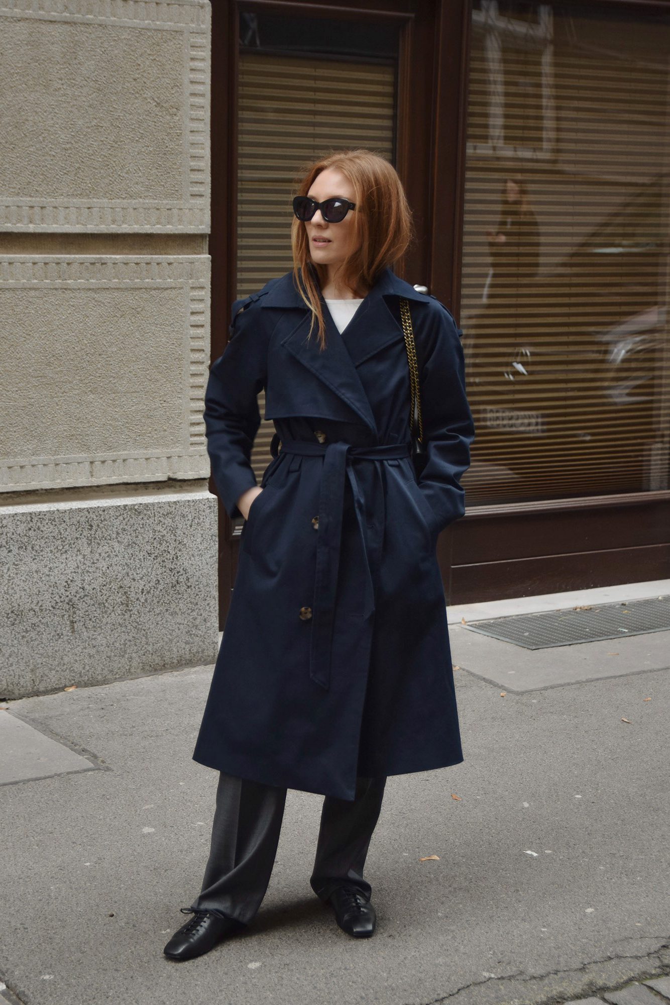 – pagony na ramionach – subtelne nawiązanie do ikonicznego stylu trencza