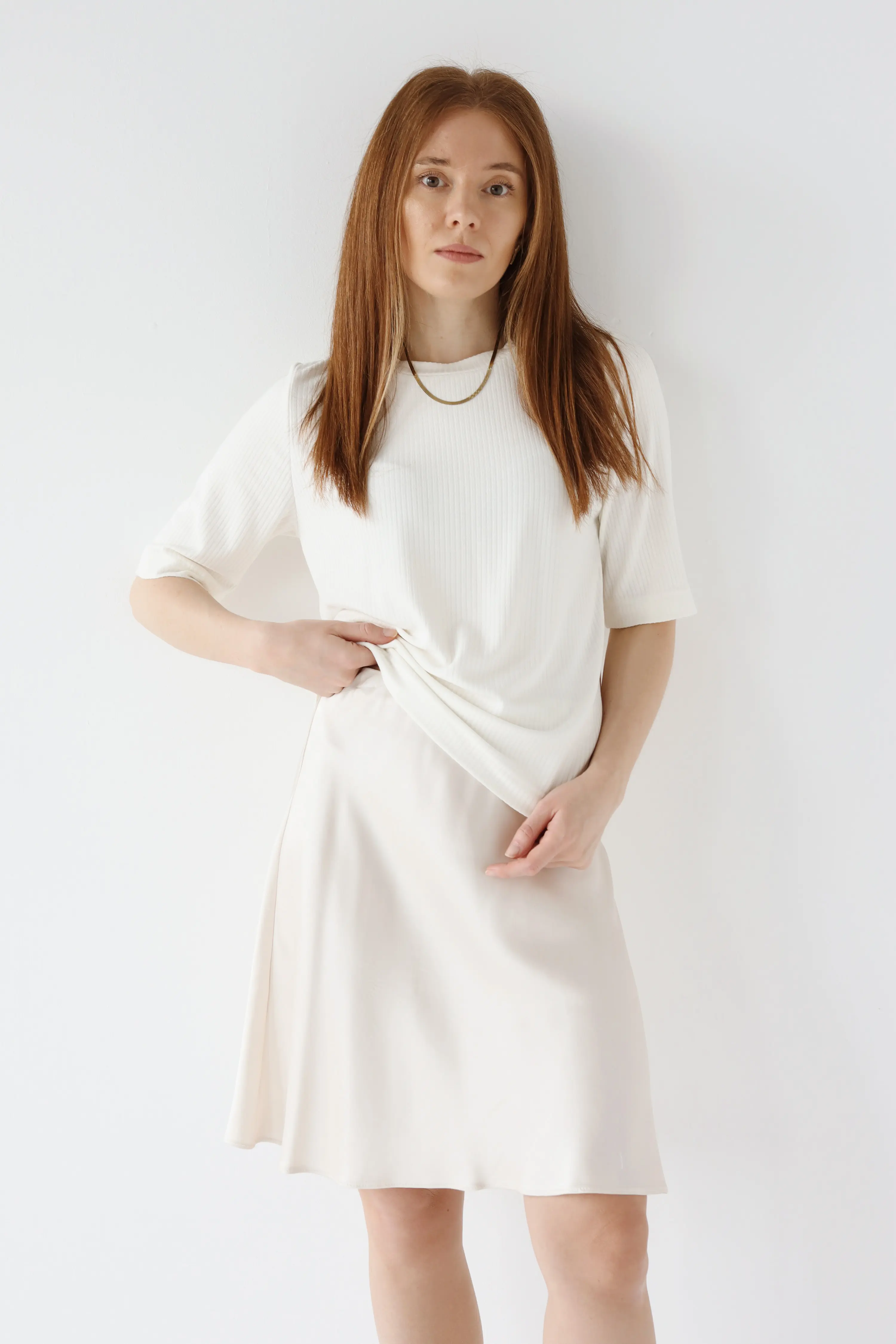 Dzięki krojeniu ze skosu materiał zyskuje większą elastyczność i lekkość, co przekłada się na komfort noszenia i naturalne dopasowanie. Delikatny połysk dodaje całości elegancji, a perłowy odcień podkreśla jej ponadczasowy, szlachetny charakter.