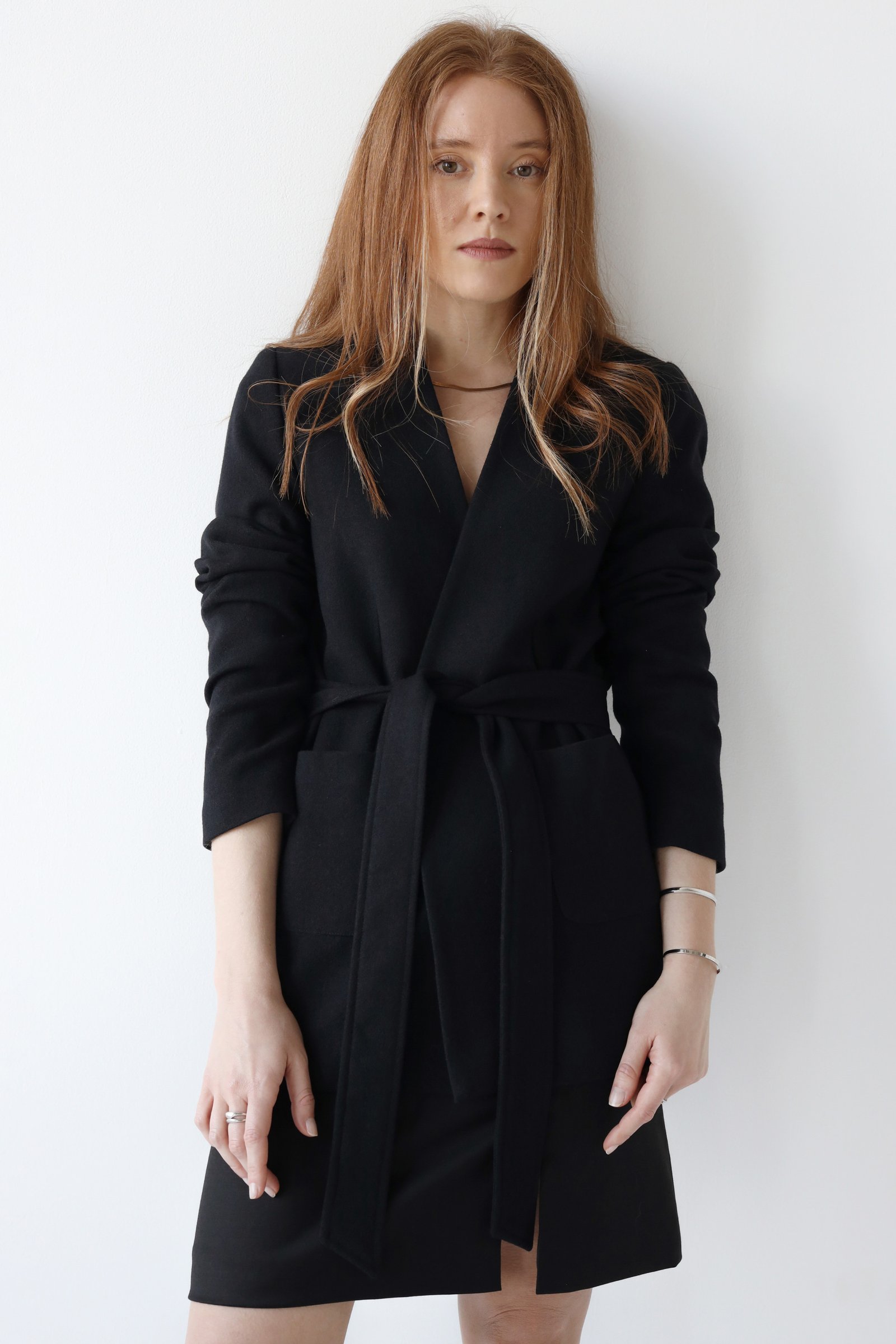 Model został odszyty z matowej, szlachetnej wełny i wykończony podszewką, dzięki czemu dobrze trzyma formę i komfortowo nosi się przez cały dzień. Dołączony pasek pozwala podkreślić talię lub pozostawić marynarkę w bardziej swobodnej, otwartej formie.