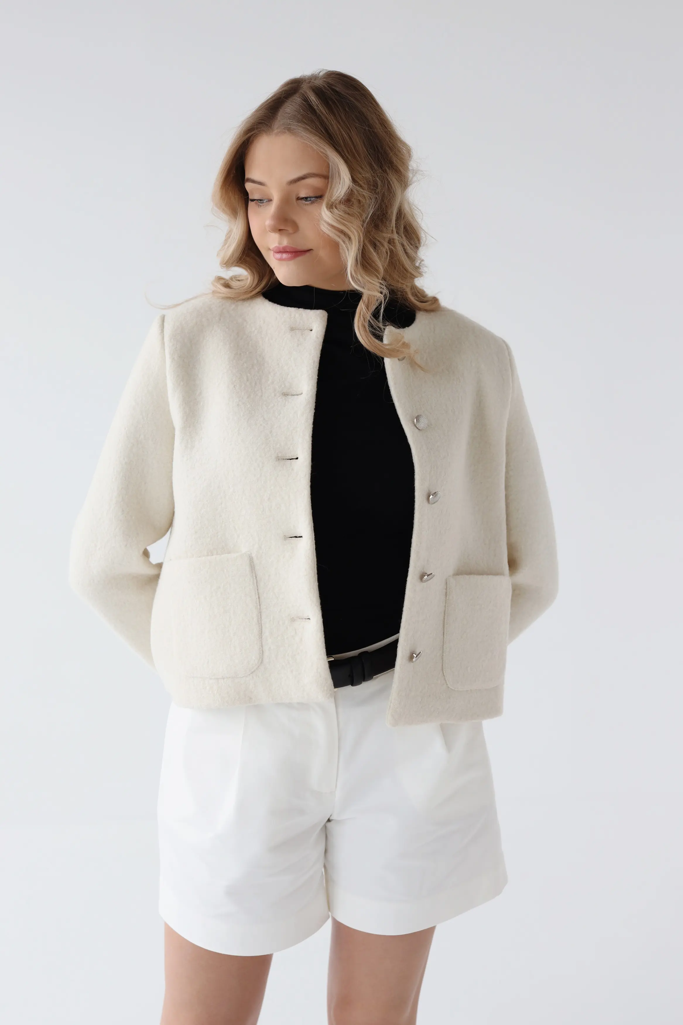 Lekka wełna ma właściwości termoregulacyjne – dopasowuje się do temperatury ciała, oddycha i zapewnia komfort zarówno wewnątrz, jak i na zewnątrz. Dzięki temu żakiet może pełnić funkcję wiosennego okrycia, szczególnie w miejskich stylizacjach.