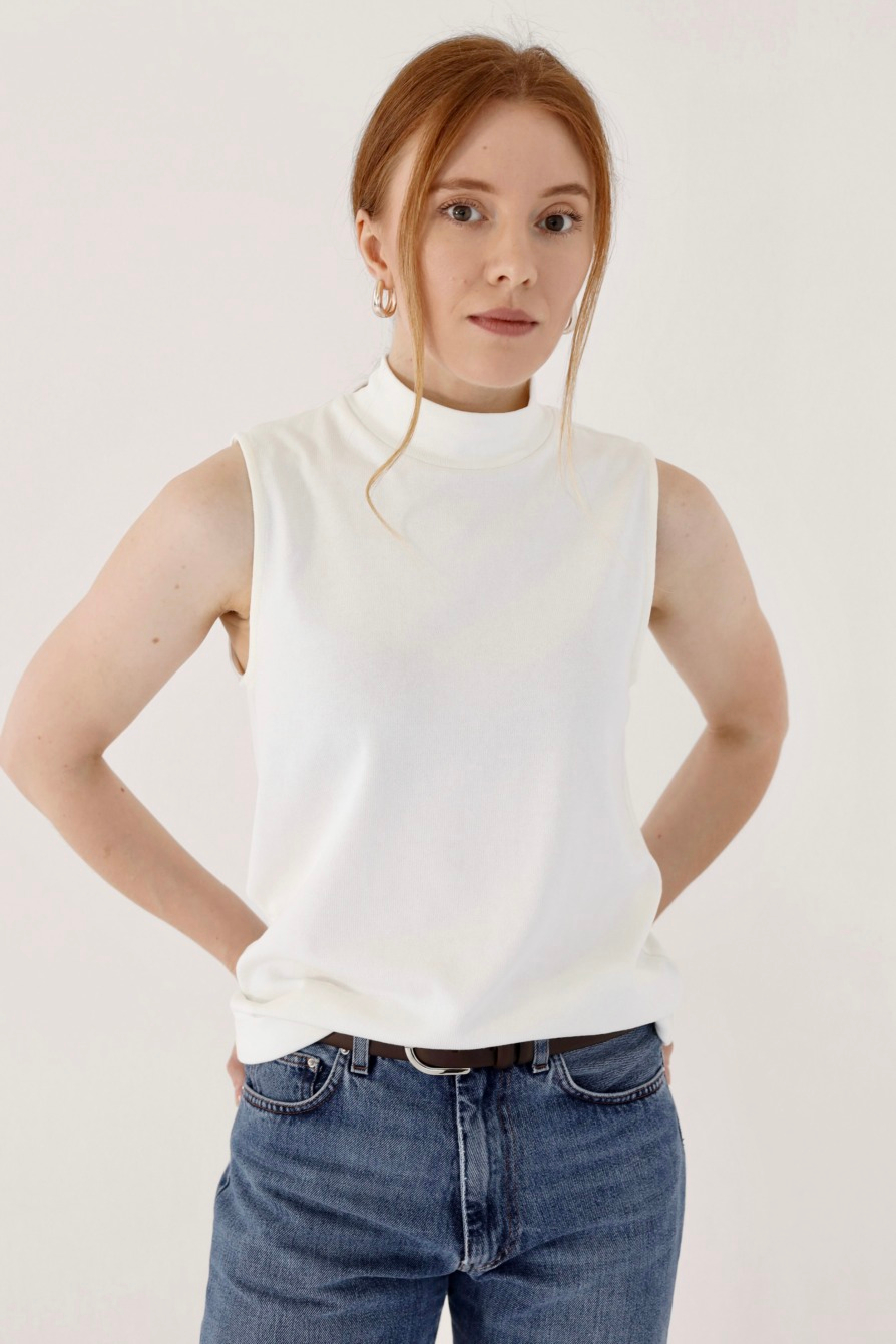 Półgolf ADDISON z lekkiej dzianiny bawełnianej. Minimalistyczny fason bez rękawów z półgolfem, uszyty z wysokiej jakości dzianiny bawełnianej o sweterkowej strukturze. Prosty, nieco luźniejszy krój pięknie układa się na sylwetce, a półgolf dodaje mu elegancji i nowoczesnego charakteru.