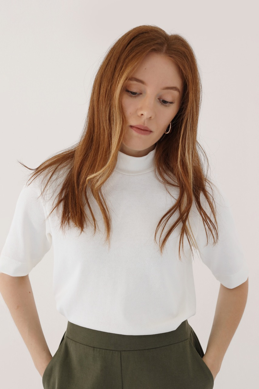 Półgolf sweterkowy ELAINE o luźnej formie z rękawkiem do łokcia. Minimalistyczny i ponadczasowy – uszyty z wysokiej jakości lekkiej dzianiny bawełnianej o sweterkowej strukturze. Prosty fason z delikatnie luźniejszym krojem sprawia, że świetnie układa się na sylwetce i zapewnia pełen komfort noszenia. Charakterystyczny półgolf dodaje elegancji i nowoczesności, jednocześnie chroniąc szyję w chłodniejsze dni.