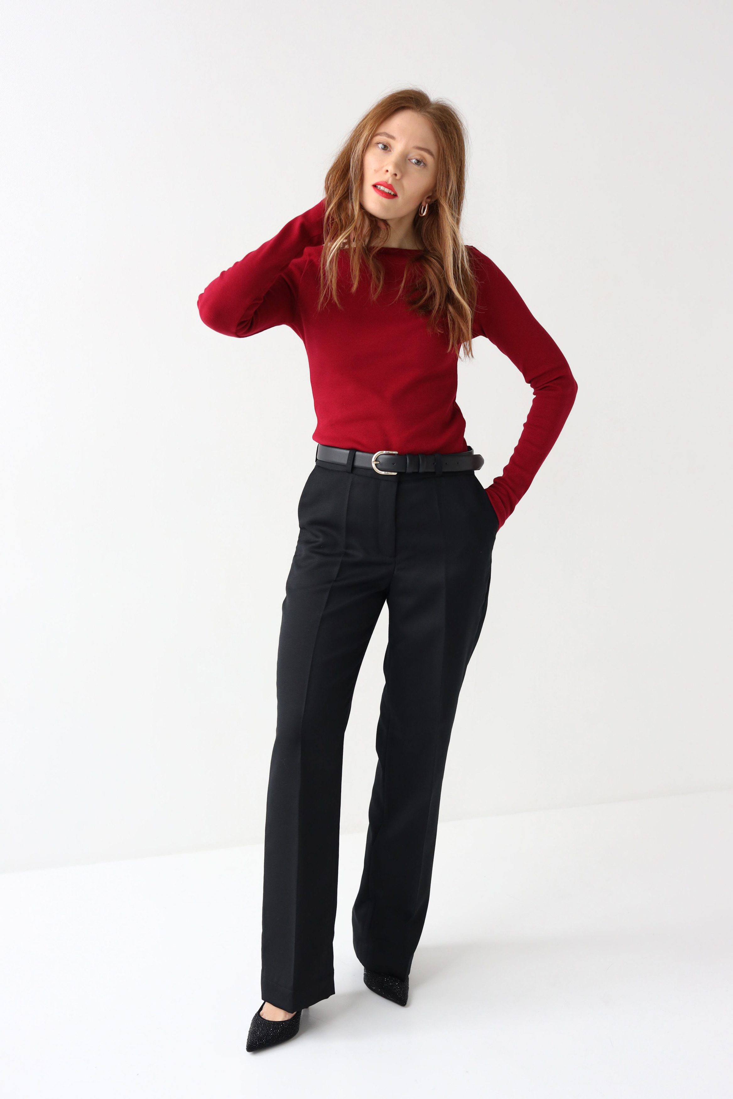 Spodnie damskie z wełny z prostymi nogawkami TRACE. Klasyczna, czarna tkanina wełniana nadaje im elegancki, nowoczesny charakter. O splocie diagonalny. Ponadczasowy krój sprawia, że łatwo dopasować je do wielu stylizacji. Wysokiej jakości wełna zapewnia komfort i naturalną termoregulację. Model całoroczny — must-have w szafie kapsułowej.