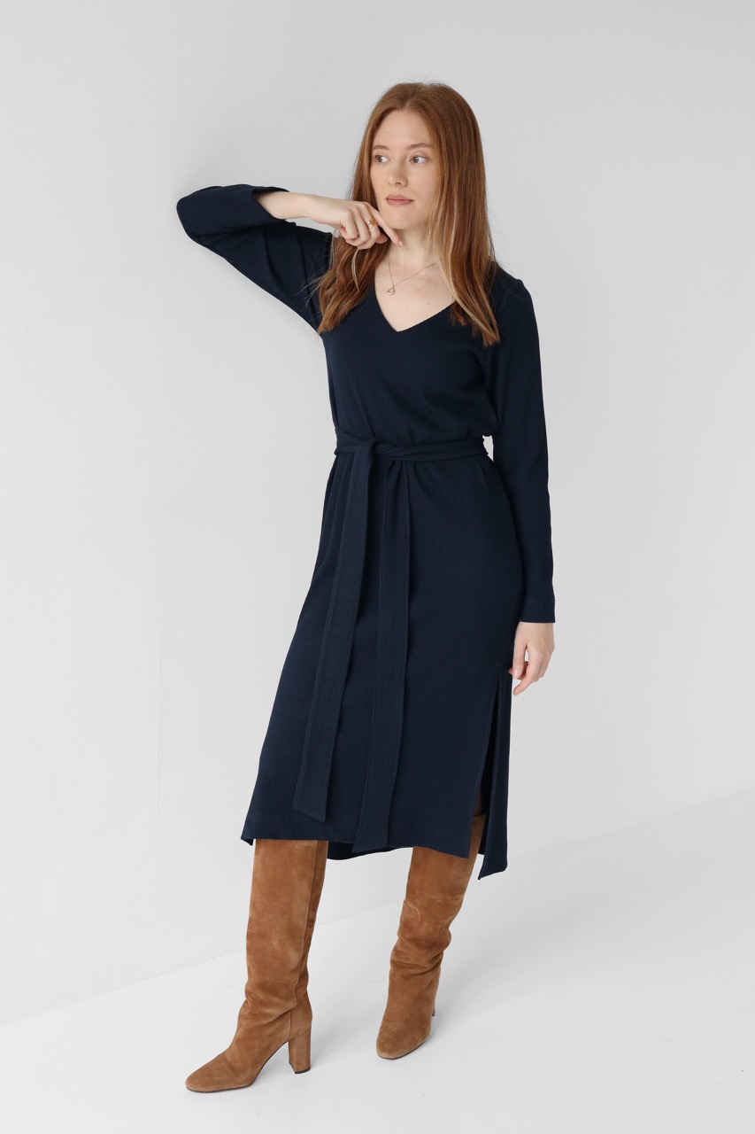 Sukienka dzianinowa z paskiem – ESTHERA. Sukienka ma luźną formę, długość midi i rozcięcia po bokach, które nadają jej kobiecego i lekkiego charakteru. Piękny dekolt V podkreśli i wysmukli sylwetkę. To propozycja dla Kobiet kochających komfort. Sukienka ma lekko dłuższy tył od przodu – świetnie komponuje się z kozakami i botkami, ale możesz wystylizować ją na sportowo ze sneakersami. Sukienka występuje w 2 łamanych rozmiarach S/M oraz L/XL. Możesz nosić ją puszczoną luzem lub przewiązać ją paskiem z tej samej dzianiny lub skórzanym.