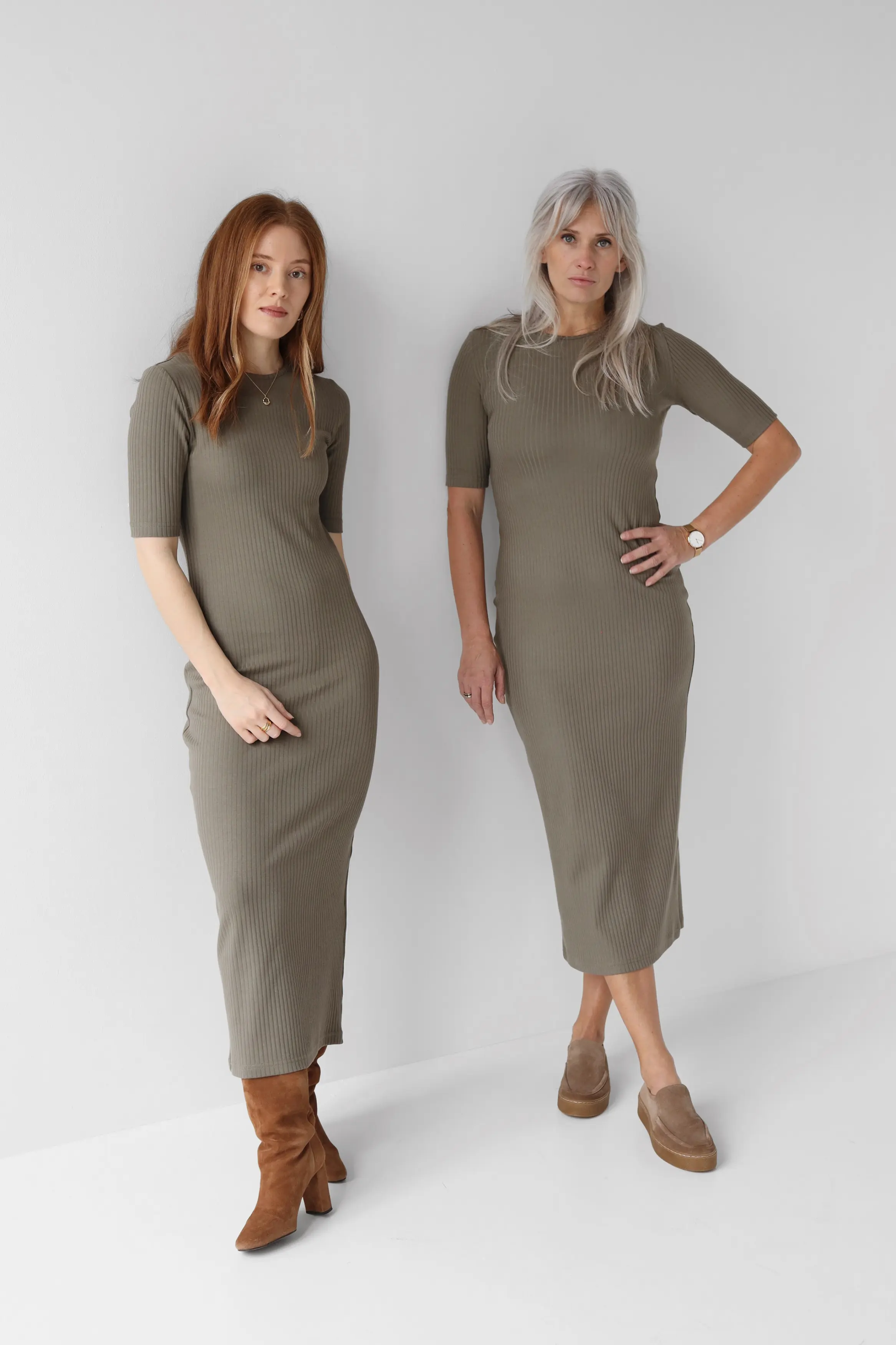 Fason z rękawem do łokcia sprawia, że sukienka świetnie sprawdzi się zarówno na co dzień, jak i w eleganckich stylizacjach. Elastyczna, oddychająca tkanina daje wygodę noszenia, a minimalistyczny krój czyni ją doskonałą bazą do kapsułowej garderoby.