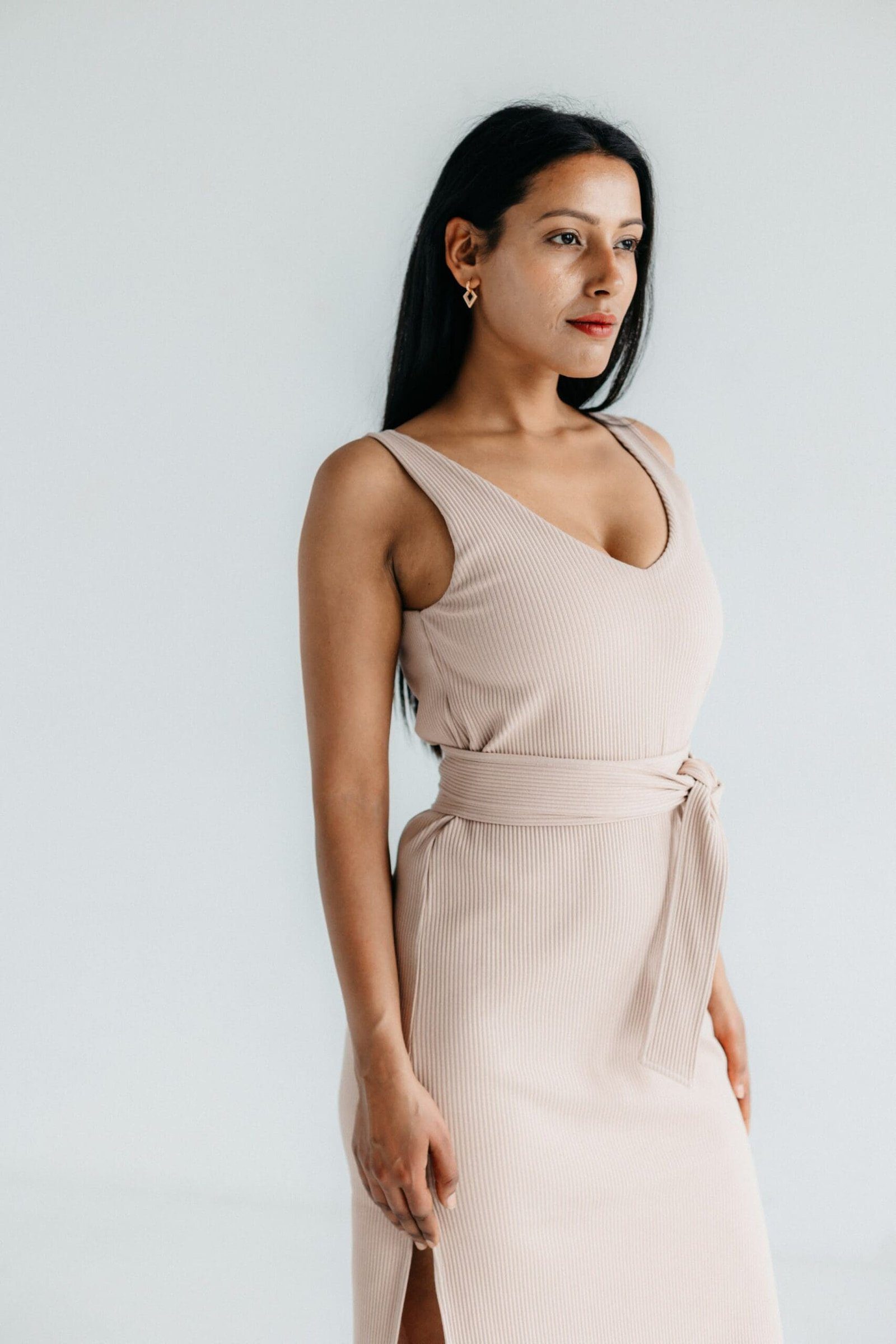 Sukienka o luźnym kroju CAMILLA. Stworzyliśmy dla Ciebie sukienkę, która jest wyjątkowa. Możesz nosić ją puszczoną luźno lub przewiązać paskiem. Wszystko po to, byś mogła ją dopasować jak najlepiej do siebie! CAMILLA ma piękny dekolt V z przodu oraz z tyłu. Górna część sukienki składa się z podwójnego materiału. Wewnętrzna część dekoltu może służyć jako lekki stanik, który pomoże wymodelować Twoją sylwetkę. Dół sukienki, to lekka asymetria, a rozcięcia po bokach nadają jej zwiewnego charakteru. Dzianina jest niezwykle miękka i poddaje się ruchom Twojego ciała.