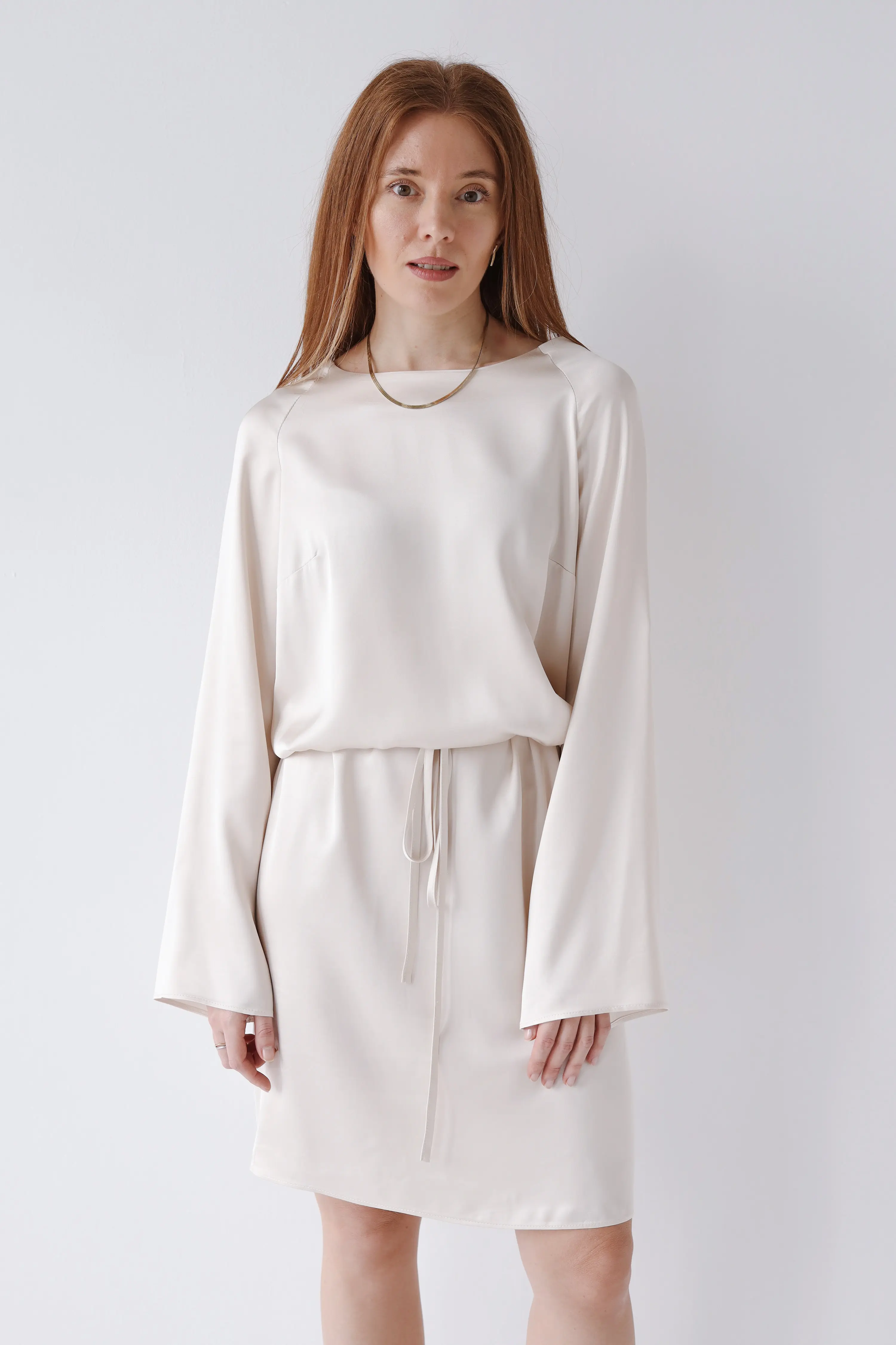 Sukienka satynowa z szerokimi rękawami i paskiem MABEL. To satynowa forma o czystej, eleganckiej linii. Model z raglanowymi, szerokimi rękawami miękko układa się na sylwetce, tworząc swobodny, ale dopracowany efekt.