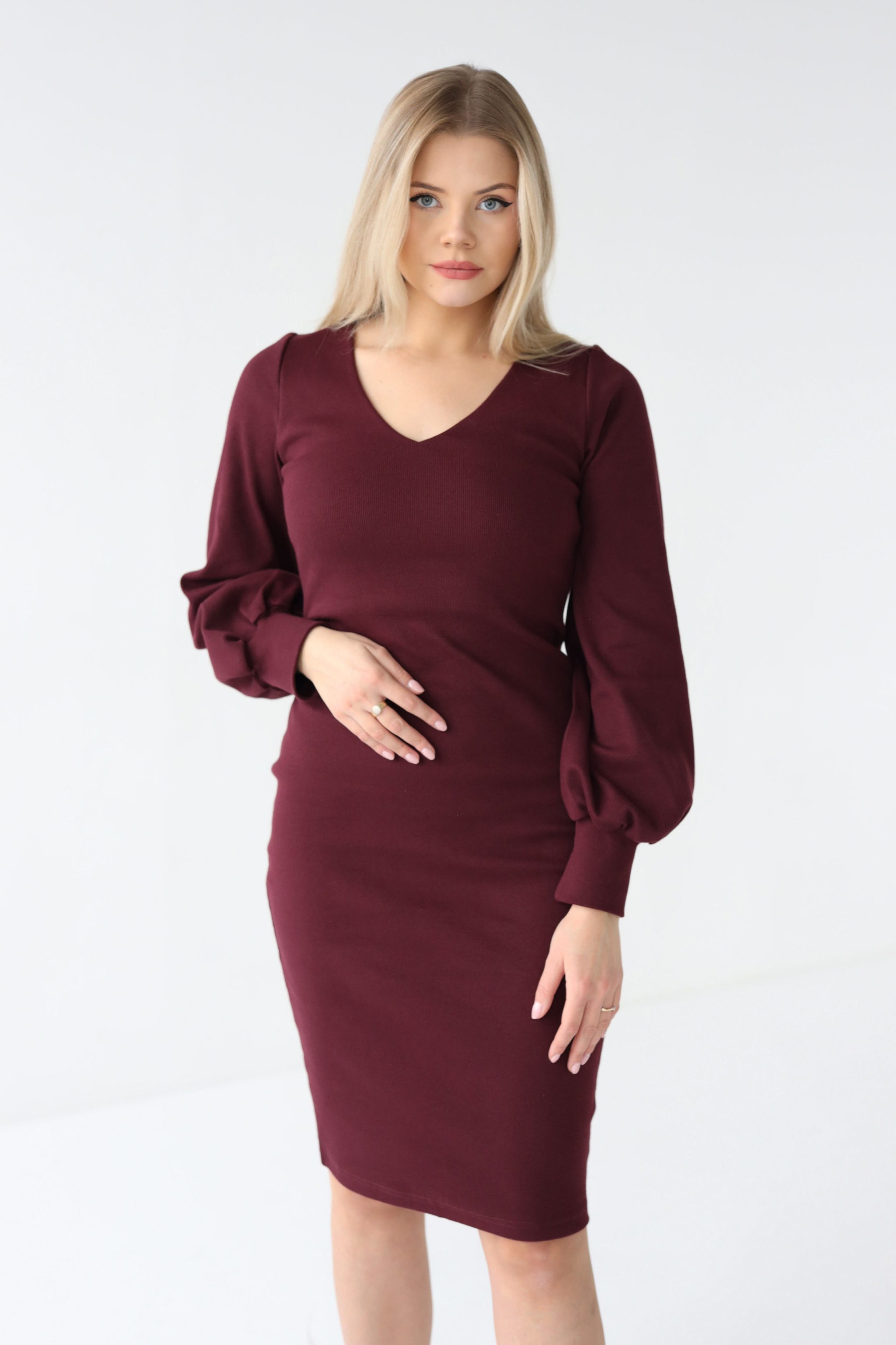 Sukienka z dekoltem V z bufiastym rękawem Violette. Klasyczny, elegancki model wykonany z dzianiny prążkowanej o drobnym splocie. Charakteru nadają jej bufiaste rękawy, które podkreślają sylwetkę i dodają formie lekkości. Idealna na wyjątkowe okazje.