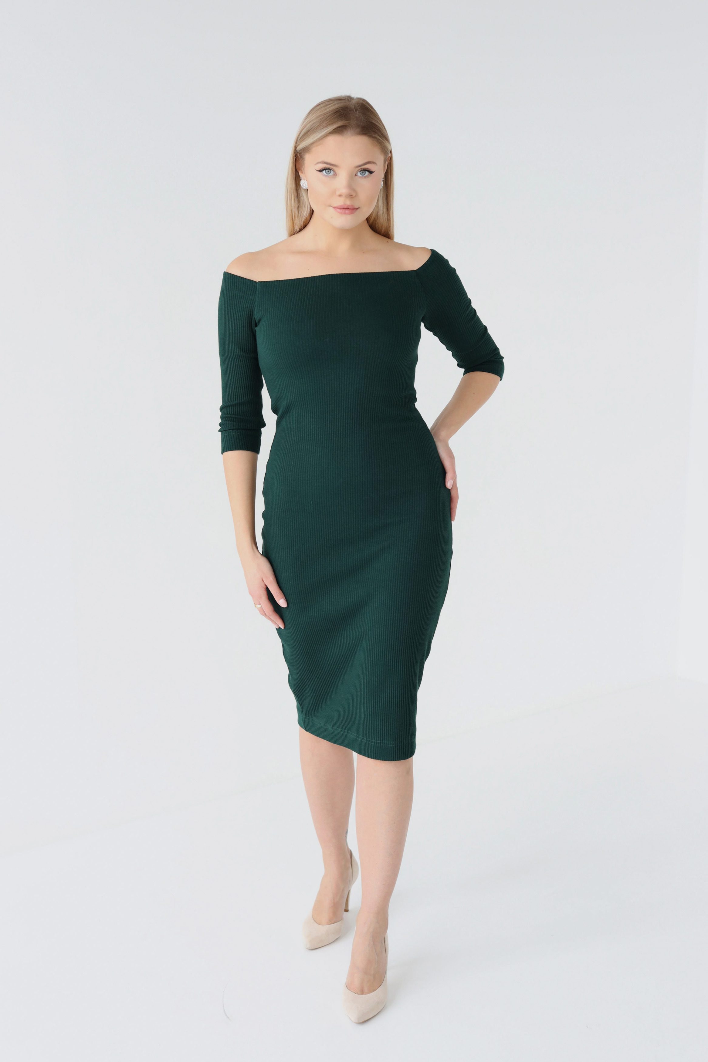 Sukienka z odsłoniętą linią szyi Noelle. Pięknie eksponuje ramiona i podkreśla kobiecy charakter stylizacji. Model z rękawami 3/4, które można delikatnie podciągnąć, tworząc bardziej zabudowaną formę.