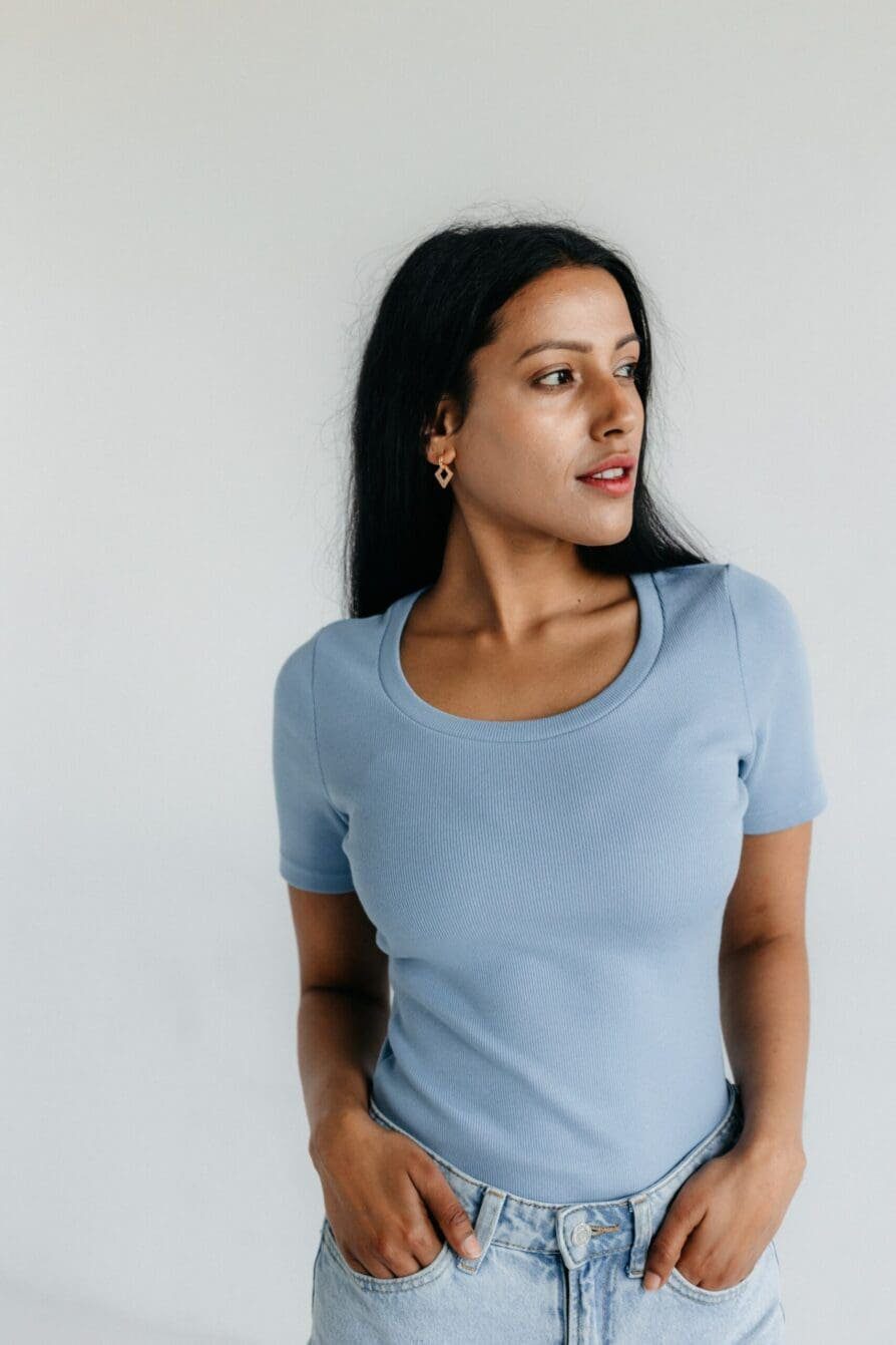 T-shirt z okrągłym dekoltem z dzianiny prążkowanej – ELLEN. Prosta i minimalistyczna forma sprawia, że t-shirt pasuje do wielu stylizacji i jest ponadczasowy. Świetnie komponuje się z marynarką, jak i jeansową kurtką czy kardiganem. To idealny element garderoby kapsułowej. T-shirt został odszyty z dzianiny prążkowanej o drobnym splocie.