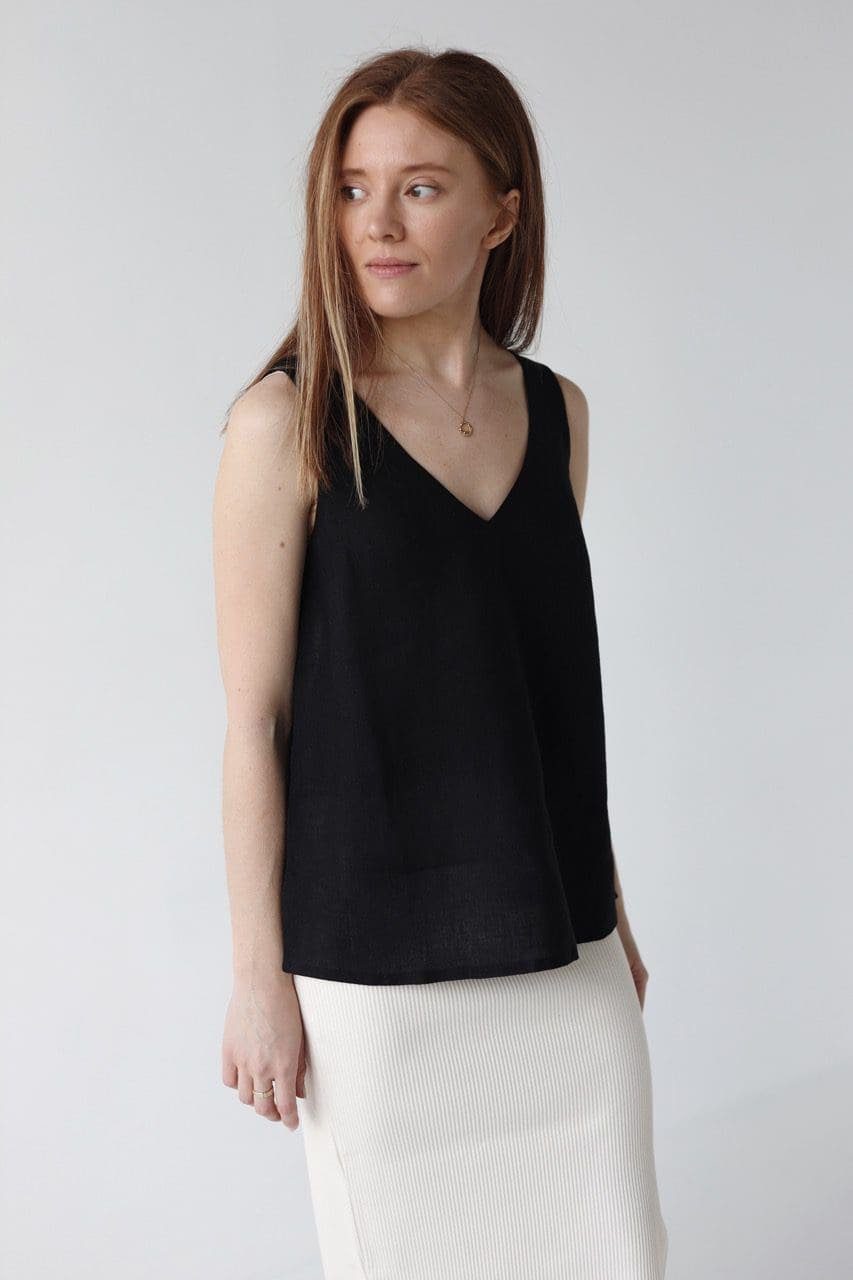 Top z lnu o luźnym kroju z dekoltem V. Top ma luźną formę i świetnie dopełni Twoje letnie stylizacje. Top ma w górnej części podwójną tkaninę, a tylny dekolt V jest nieco wyższy od przedniego tak, by stabilizował szelki i nie odsłaniał stanika. Po bokach me lekkie rozcięcia. Top świetnie pasuje do jeansów, szortów i spódnic.
